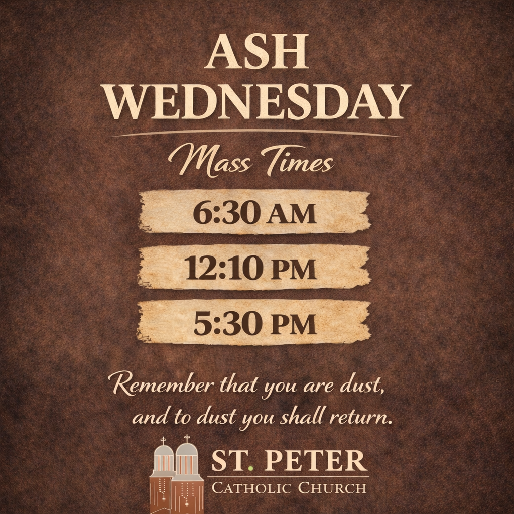Ash Wednesday Mass Times Wednesday, February 18, 2026 6:30 AM 5:30 PM Saint Peter Catholic Church 108 E St. Peter Street New Iberia, LA 70560 United States (map) Google Calendar ICS