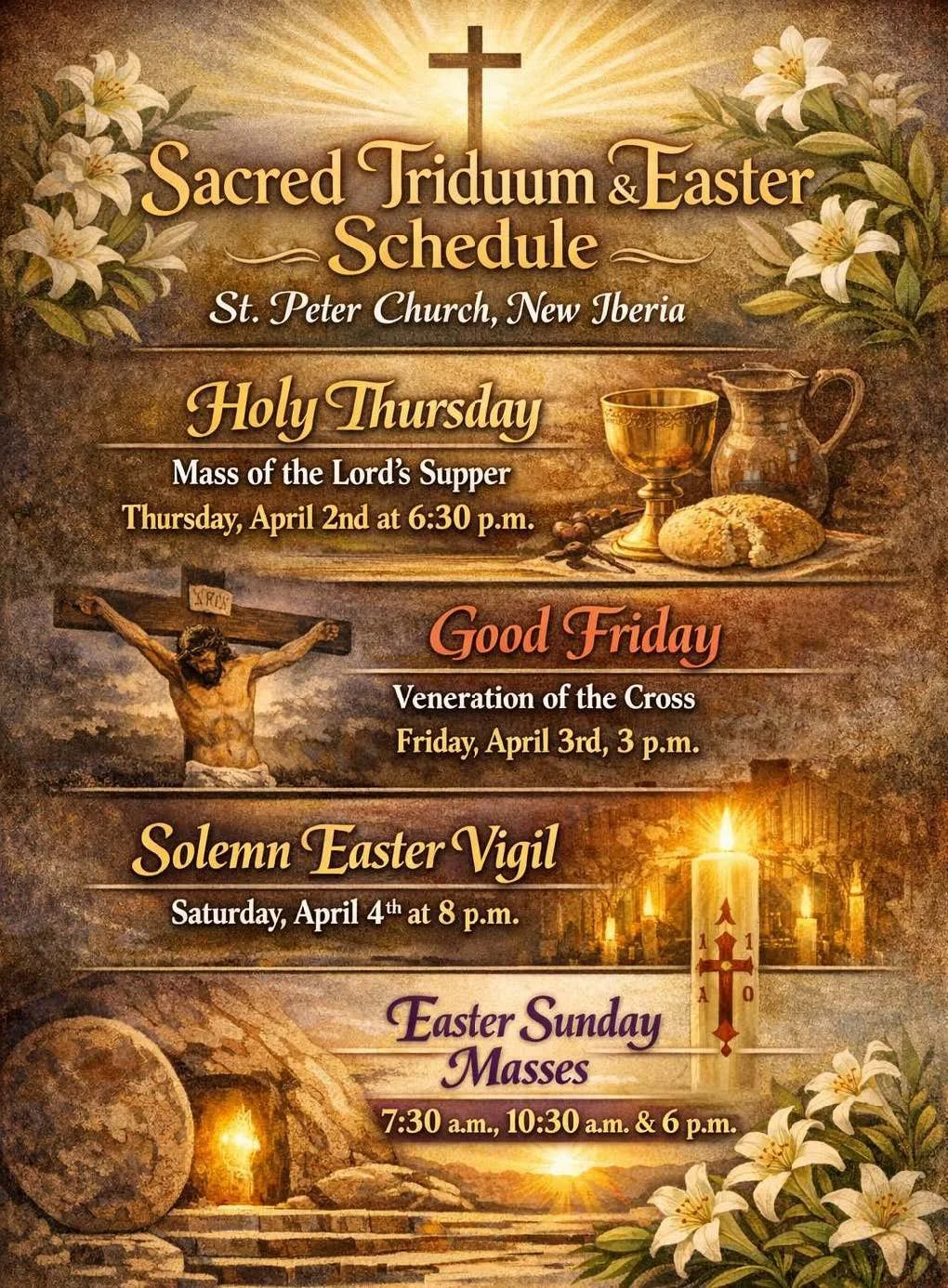 Sacred Triduum & Easter Schedule Thursday, April 2, 2026 6:30 PM Sunday, April 5, 2026 6:00 PM Saint Peter Catholic Church 108 E St. Peter Street New Iberia, LA 70560 United States (map) Google Calendar ICS